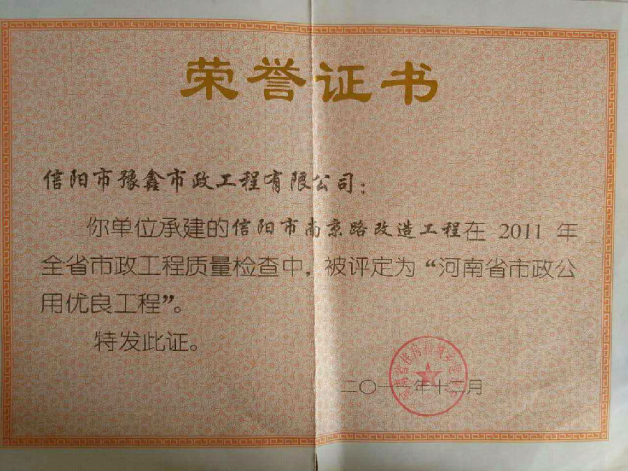 好風(fēng)憑借力,送我上青云。近年來,公司積極參與城市市政基礎(chǔ)設(shè)施建設(shè)施工,積極參與市場競爭,先后承擔(dān)施工了市政府重點工程南京路道路改造工程、春曉路道路改造工程,東方紅大道道路改造工程、龍江東路新建工程等重點民生工程,其中南京路道路改造工程被省建設(shè)廳評為“中州杯”, 春曉路和東方紅大道道路改造工程被省建設(shè)廳評為“省優(yōu)工程”,成為城區(qū)一道道亮麗的風(fēng)景線。參與施工了市典范小區(qū)“臺北城上城”、“恒大名都”以及師范學(xué)院、職業(yè)技術(shù)學(xué)院、交警支隊和軍區(qū)道路工程,參與施工了雞公山管理區(qū)、南灣管理區(qū)、明港鎮(zhèn)和羅山縣等部分道路小區(qū)工程施工,累計大小各類施工工程三百余項,企業(yè)影響力不斷擴大、輻射力不斷增強,市場份額不斷提高,企業(yè)信譽不斷彰顯,為信陽城市建設(shè)做出了積極貢獻(xiàn),為企業(yè)的可持續(xù)發(fā)展插上了騰飛的翅膀。